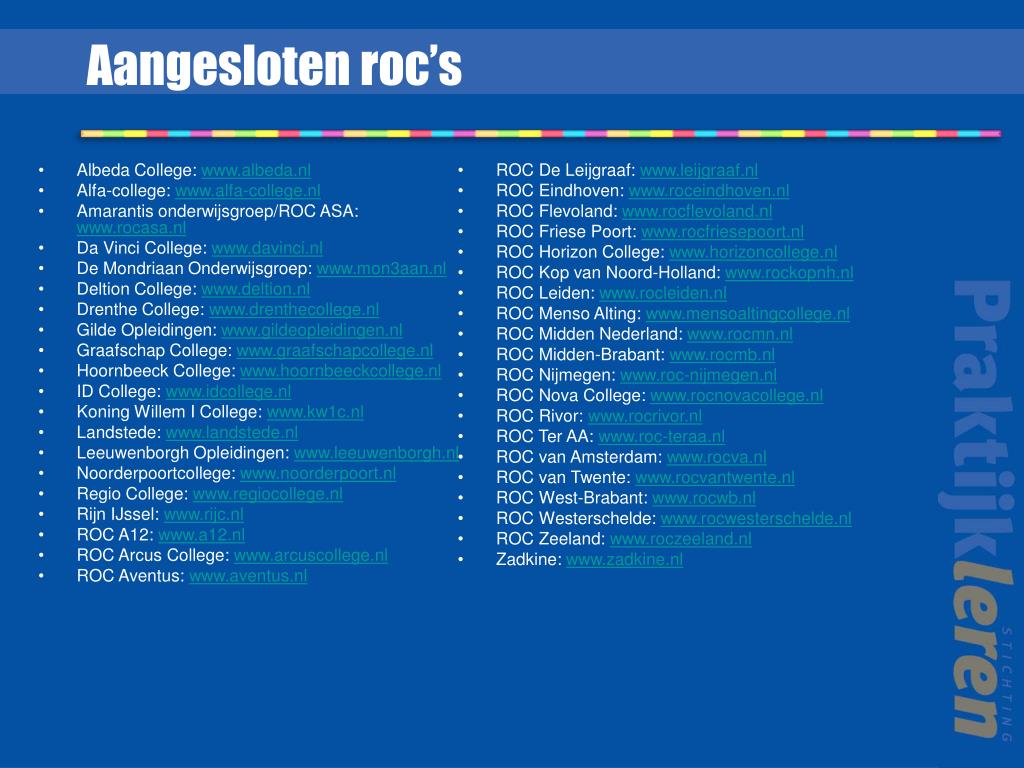 Aangesloten roc’s • Albeda College: www.albeda.nl • Alfa-college: www.alfa-college.nl • Amarantis onderwijsgroep/ROC ASA: www.rocasa.nl • Da Vinci College: www.davinci.nl • De Mondriaan Onderwijsgroep: www.mon3aan.nl • Deltion College: www.deltion.nl • Drenthe College: www.drenthecollege.nl • Gilde Opleidingen: www.gildeopleidingen.nl • Graafschap College: www.graafschapcollege.nl • Hoornbeeck College: www.hoornbeeckcollege.nl • ID College: www.idcollege.nl • Koning Willem I College: www.kw1c.nl • Landstede: www.landstede.nl • Leeuwenborgh Opleidingen: www.leeuwenborgh.nl • Noorderpoortcollege: www.noorderpoort.nl • Regio College: www.regiocollege.nl • Rijn IJssel: www.rijc.nl • ROC A12: www.a12.nl • ROC Arcus College: www.arcuscollege.nl • ROC Aventus: www.aventus.nl • ROC De Leijgraaf: www.leijgraaf.nl • ROC Eindhoven: www.roceindhoven.nl • ROC Flevoland: www.rocflevoland.nl • ROC Friese Poort: www.rocfriesepoort.nl • ROC Horizon College: www.horizoncollege.nl • ROC Kop van Noord-Holland: www.rockopnh.nl • ROC Leiden: www.rocleiden.nl • ROC Menso Alting: www.mensoaltingcollege.nl • ROC Midden Nederland: www.rocmn.nl • ROC Midden-Brabant: www.rocmb.nl • ROC Nijmegen: www.roc-nijmegen.nl • ROC Nova College: www.rocnovacollege.nl • ROC Rivor: www.rocrivor.nl • ROC Ter AA: www.roc-teraa.nl • ROC van Amsterdam: www.rocva.nl • ROC van Twente: www.rocvantwente.nl • ROC West-Brabant: www.rocwb.nl • ROC Westerschelde: www.rocwesterschelde.nl • ROC Zeeland: www.roczeeland.nl • Zadkine: www.zadkine.nl
