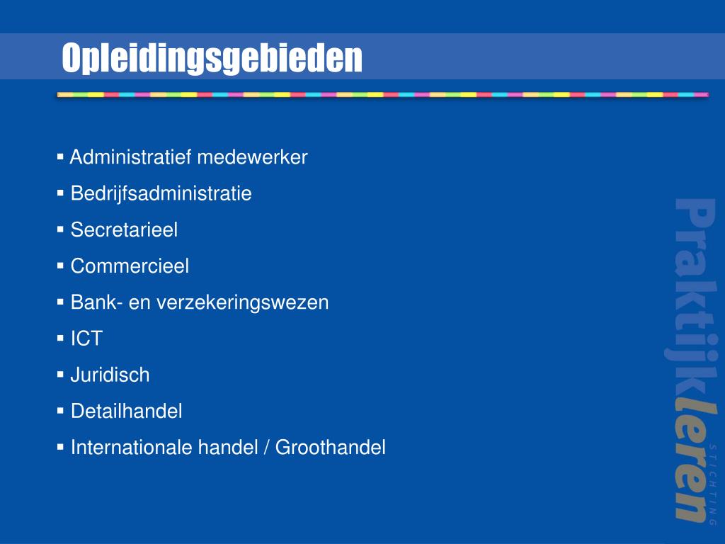 Opleidingsgebieden • Administratief medewerker • Bedrijfsadministratie • Secretarieel • Commercieel • Bank- en verzekeringswezen • ICT • Juridisch • Detailhandel • Internationale handel / Groothandel