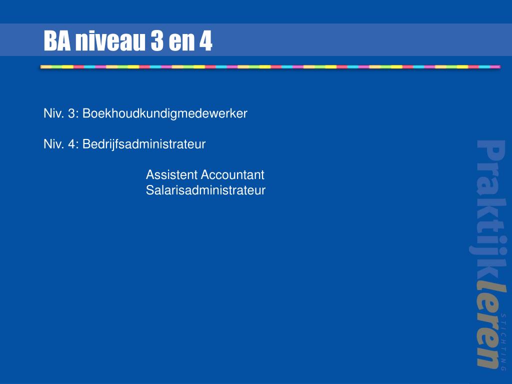 BA niveau 3 en 4 Niv. 3: Boekhoudkundigmedewerker Niv. 4: Bedrijfsadministrateur Assistent Accountant Salarisadministrateur