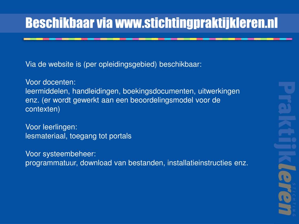 Beschikbaar via www.stichtingpraktijkleren.nl Via de website is (per opleidingsgebied) beschikbaar: Voor docenten: leermiddelen, handleidingen, boekingsdocumenten, uitwerkingen enz. (er wordt gewerkt aan een beoordelingsmodel voor de contexten) Voor leerlingen: lesmateriaal, toegang tot portals Voor systeembeheer: programmatuur, download van bestanden, installatieinstructies enz.