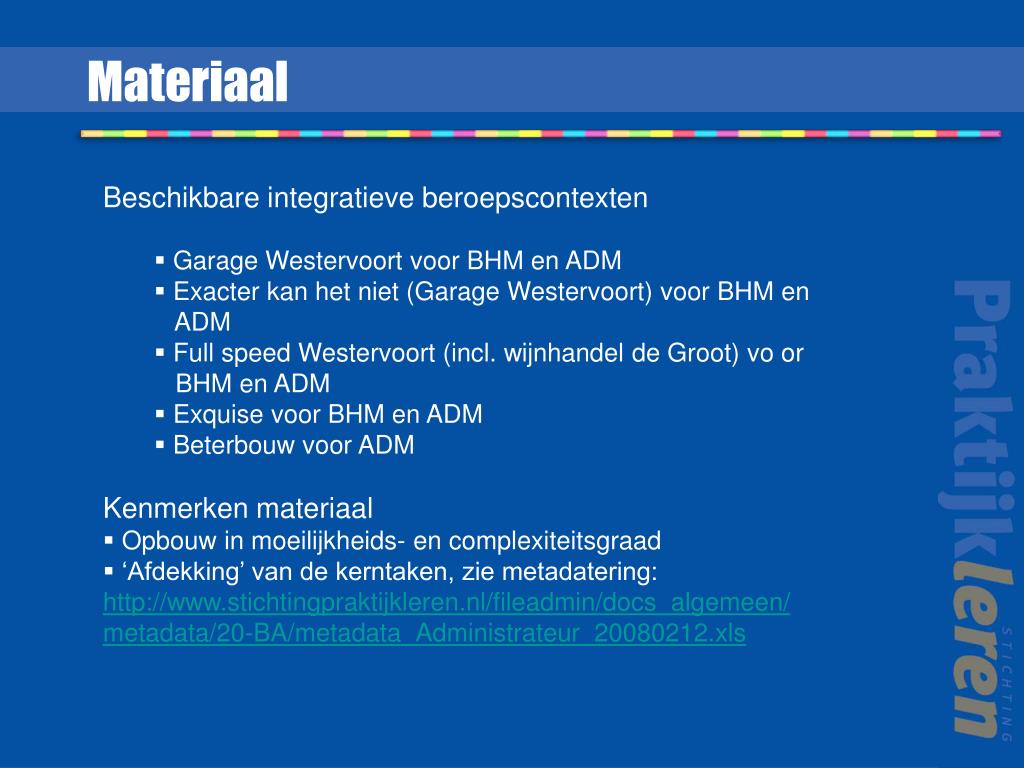 Materiaal • Beschikbare integratieve beroepscontexten • Garage Westervoort voor BHM en ADM • Exacter kan het niet (Garage Westervoort) voor BHM en ADM • Full speed Westervoort (incl. wijnhandel de Groot) vo or BHM en ADM • Exquise voor BHM en ADM • Beterbouw voor ADM • Kenmerken materiaal • Opbouw in moeilijkheids- en complexiteitsgraad • ‘Afdekking’ van de kerntaken, zie metadatering: • http://www.stichtingpraktijkleren.nl/fileadmin/docs_algemeen/ • metadata/20-BA/metadata_Administrateur_20080212.xls