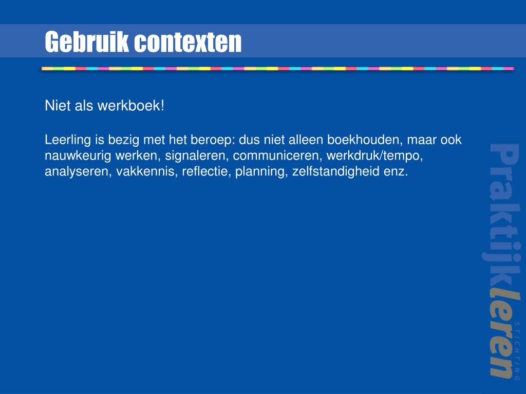 Gebruik contexten Niet als werkboek! Leerling is bezig met het beroep: dus niet alleen boekhouden, maar ook nauwkeurig werken, signaleren, communiceren, werkdruk/tempo, analyseren, vakkennis, reflectie, planning, zelfstandigheid enz.