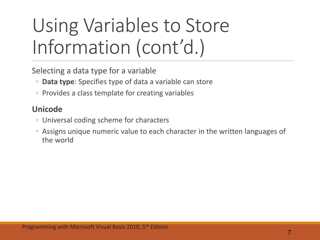 Using Variables to Store Information (cont’d.) • Selecting a data type for a variable • Data type: Specifies type of data a variable can store • Provides a class template for creating variables • Unicode • Universal coding scheme for characters • Assigns unique numeric value to each character in the written languages of the world