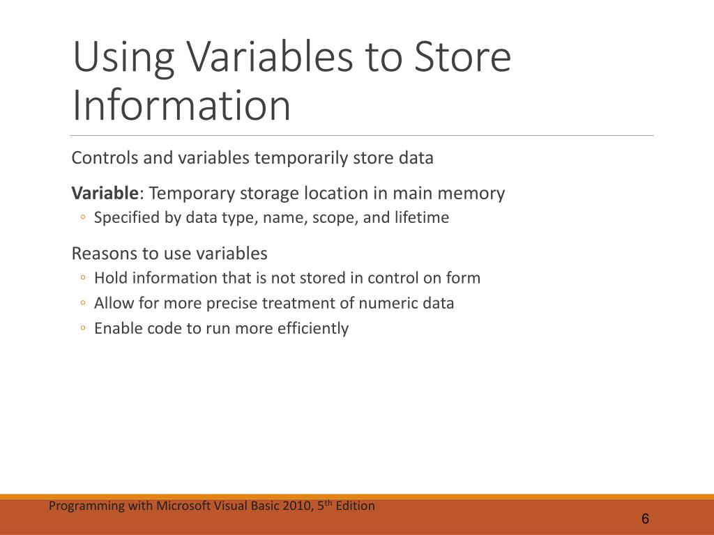 Using Variables to Store Information • Controls and variables temporarily store data • Variable: Temporary storage location in main memory • Specified by data type, name, scope, and lifetime • Reasons to use variables • Hold information that is not stored in control on form • Allow for more precise treatment of numeric data • Enable code to run more efficiently