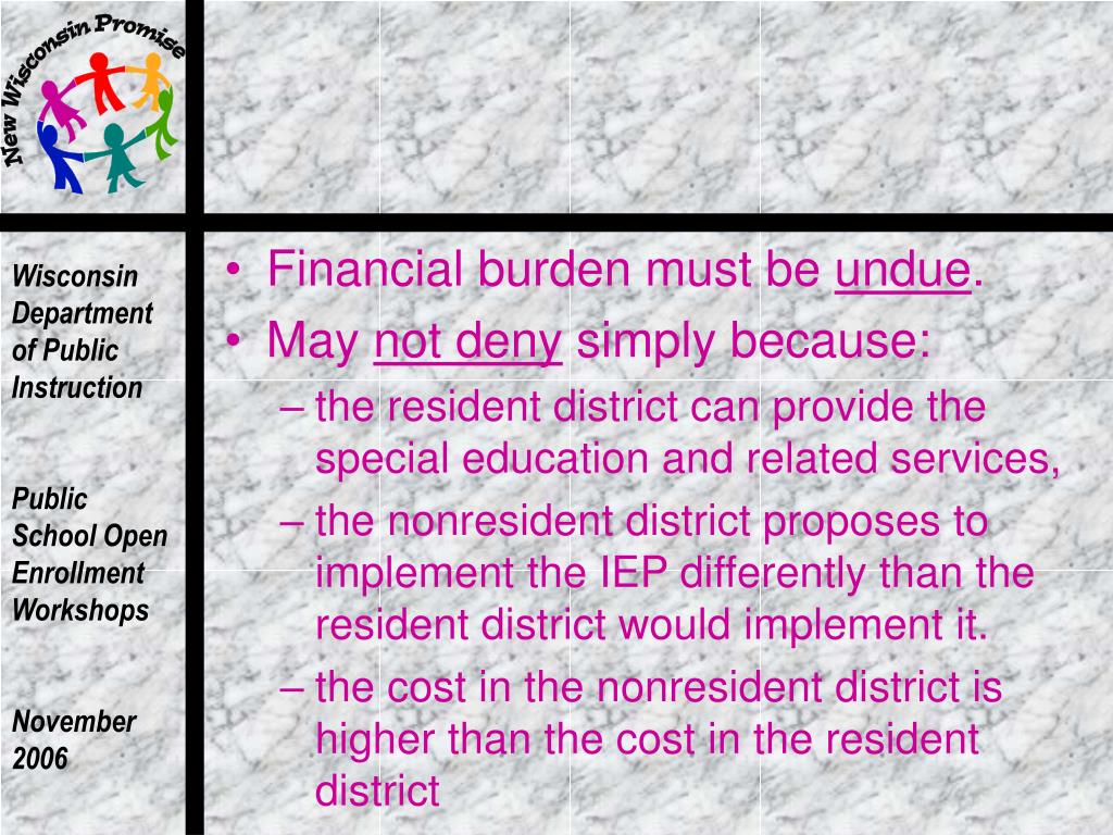 Financial burden must be undue. • May not deny simply because: • the resident district can provide the special education and related services, • the nonresident district proposes to implement the IEP differently than the resident district would implement it. • the cost in the nonresident district is higher than the cost in the resident district