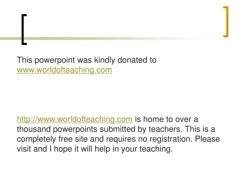 This powerpoint was kindly donated to www.worldofteaching.com http://www.worldofteaching.com is home to over a thousand powerpoints submitted by teachers. This is a completely free site and requires no registration. Please visit and I hope it will help in your teaching.