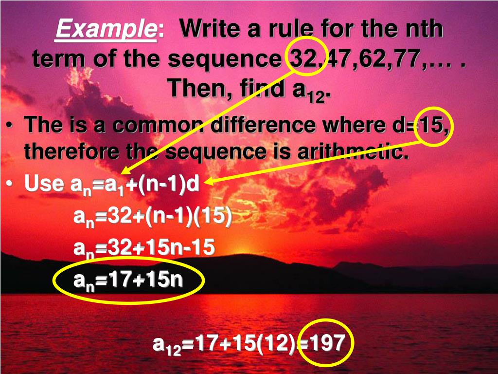 Example: Write a rule for the nth term of the sequence 32,47,62,77,… . Then, find a12. • The is a common difference where d=15, therefore the sequence is arithmetic. • Use an=a1+(n-1)d an=32+(n-1)(15) an=32+15n-15 an=17+15n a12=17+15(12)=197