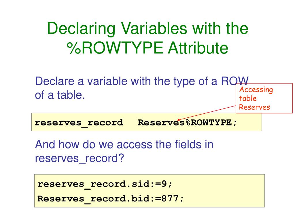 Declaring Variables with the %ROWTYPE Attribute Declare a variable with the type of a ROW of a table. And how do we access the fields in reserves_record? Accessing table Reserves reserves_record Reserves%ROWTYPE; reserves_record.sid:=9; Reserves_record.bid:=877;