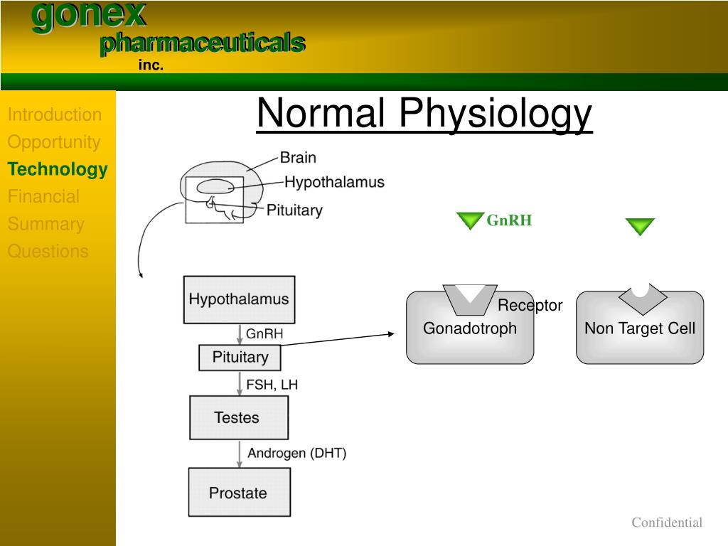 Normal Physiology Introduction Opportunity Technology Financial Summary Questions GnRH Receptor Gonadotroph Non Target Cell Testosterone Confidential