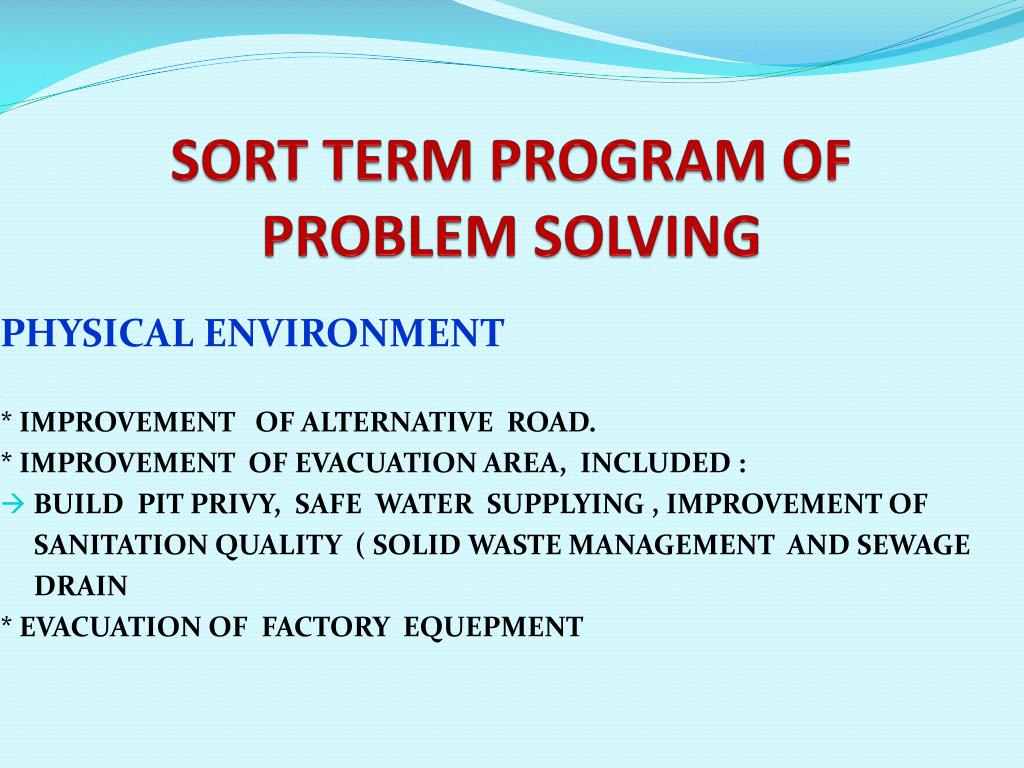 SORT TERM PROGRAM OFPROBLEM SOLVING PHYSICAL ENVIRONMENT * IMPROVEMENT OF ALTERNATIVE ROAD. * IMPROVEMENT OF EVACUATION AREA, INCLUDED : BUILD PIT PRIVY, SAFE WATER SUPPLYING , IMPROVEMENT OF SANITATION QUALITY ( SOLID WASTE MANAGEMENT AND SEWAGE DRAIN * EVACUATION OF FACTORY EQUEPMENT