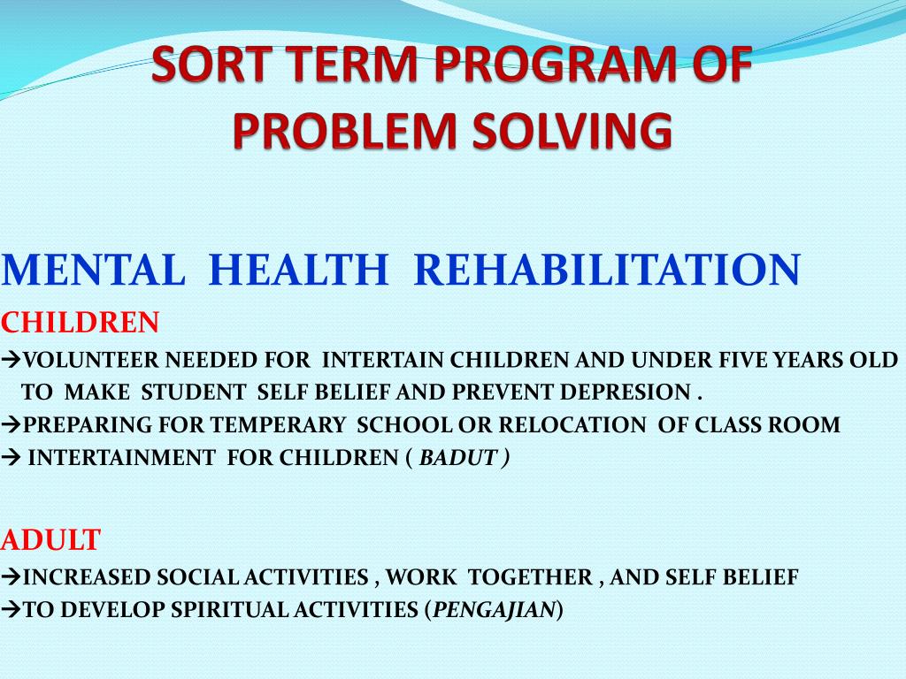 SORT TERM PROGRAM OFPROBLEM SOLVING MENTAL HEALTH REHABILITATION CHILDREN VOLUNTEER NEEDED FOR INTERTAIN CHILDREN AND UNDER FIVE YEARS OLD TO MAKE STUDENT SELF BELIEF AND PREVENT DEPRESION . PREPARING FOR TEMPERARY SCHOOL OR RELOCATION OF CLASS ROOM INTERTAINMENT FOR CHILDREN ( BADUT ) ADULT INCREASED SOCIAL ACTIVITIES , WORK TOGETHER , AND SELF BELIEF TO DEVELOP SPIRITUAL ACTIVITIES (PENGAJIAN)