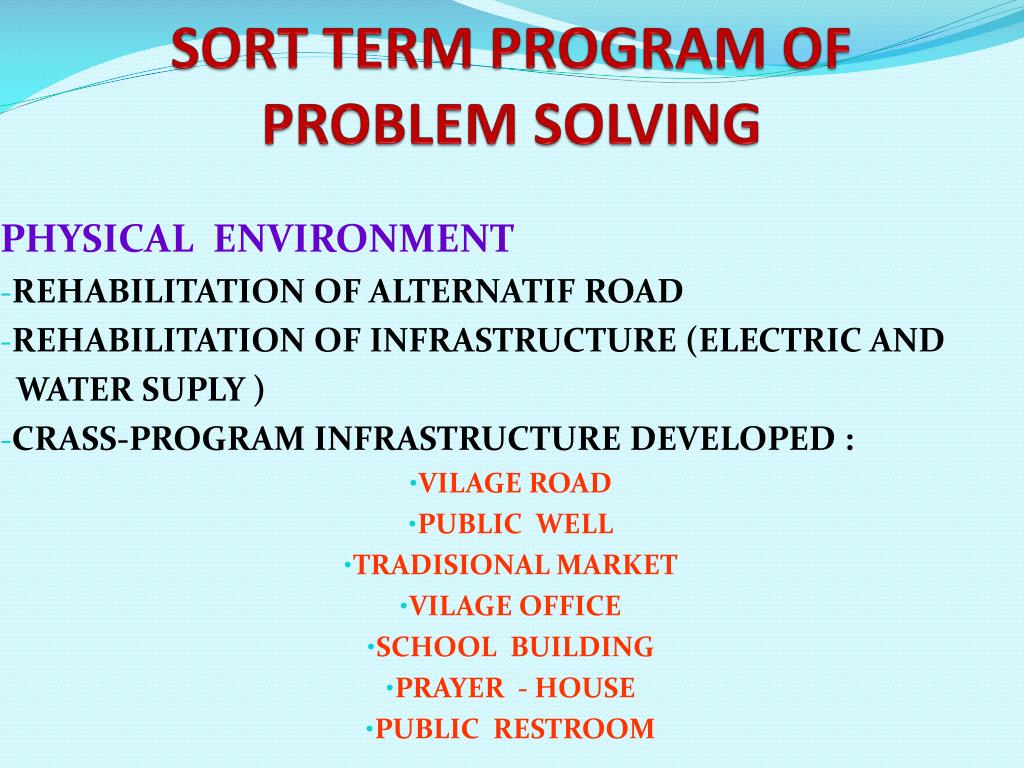 SORT TERM PROGRAM OFPROBLEM SOLVING PHYSICAL ENVIRONMENT REHABILITATION OF ALTERNATIF ROAD REHABILITATION OF INFRASTRUCTURE (ELECTRIC AND WATER SUPLY ) CRASS-PROGRAM INFRASTRUCTURE DEVELOPED : VILAGE ROAD PUBLIC WELL TRADISIONAL MARKET VILAGE OFFICE SCHOOL BUILDING PRAYER - HOUSE PUBLIC RESTROOM