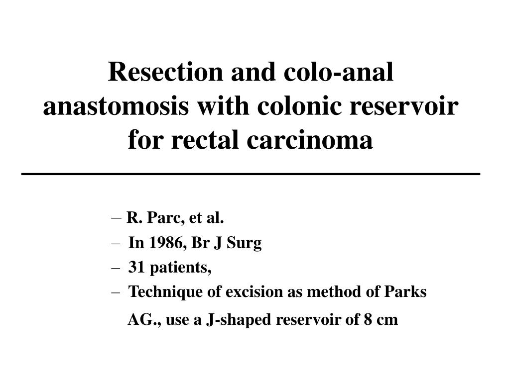 Resection and colo-anal anastomosis with colonic reservoir for rectal carcinoma • R. Parc, et al. • In 1986, Br J Surg • 31 patients, • Technique of excision as method of Parks • AG., use a J-shaped reservoir of 8 cm
