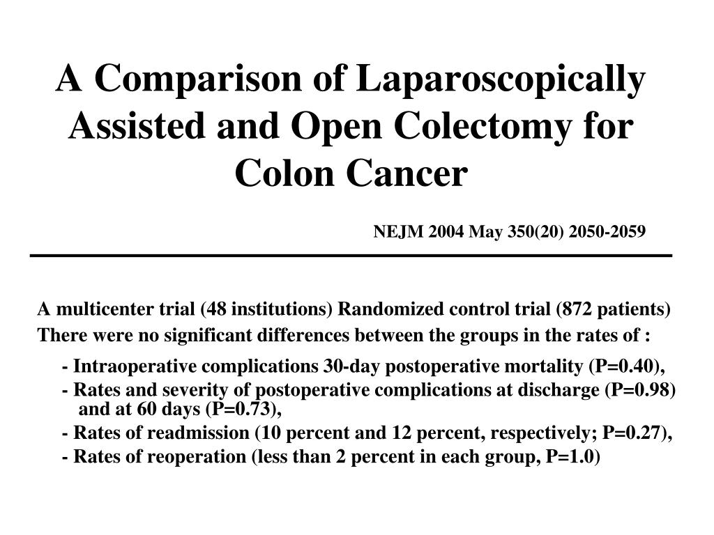 A Comparison of Laparoscopically Assisted and Open Colectomy for Colon CancerNEJM 2004 May 350(20) 2050-2059 A multicenter trial (48 institutions) Randomized control trial (872 patients) There were no significant differences between the groups in the rates of : - Intraoperative complications 30-day postoperative mortality (P=0.40), - Rates and severity of postoperative complications at discharge (P=0.98) and at 60 days (P=0.73), - Rates of readmission (10 percent and 12 percent, respectively; P=0.27), - Rates of reoperation (less than 2 percent in each group, P=1.0)