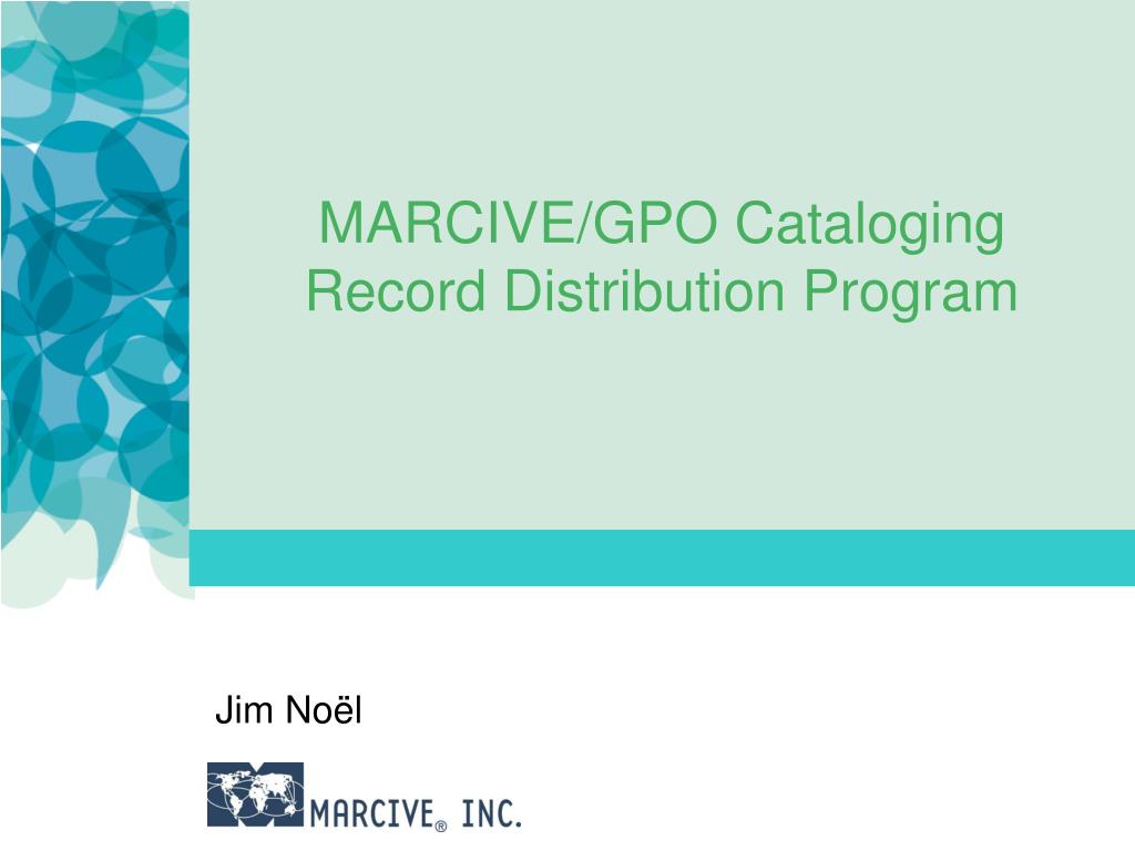 MARCIVE/GPO Cataloging Record Distribution Program. Jim Noël. Federal Depository Library Program (FDLP) Cataloging Record Distribution Pilot Project kicked off February 2010.