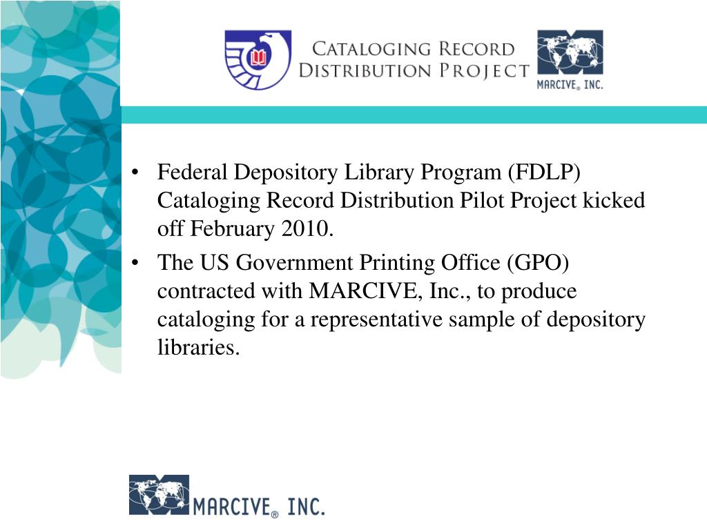 Federal Depository Library Program (FDLP) Cataloging Record Distribution Pilot Project kicked off February 2010. • The US Government Printing Office (GPO) contracted with MARCIVE, Inc., to produce cataloging for a representative sample of depository libraries.