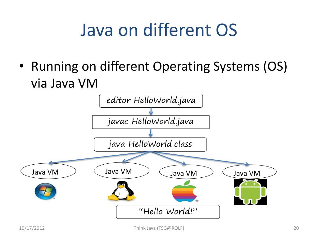 Java on different OS • Running on different Operating Systems (OS) via Java VM editor HelloWorld.java javac HelloWorld.java java HelloWorld.class Java VM Java VM Java VM Java VM “Hello World!” Think Java (TSG@ROLF)