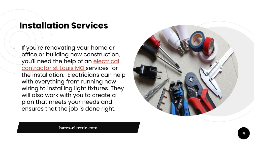 Installation Services If you're renovating your home or office or building new construction, you'll need the help of anelectrical contractor st Louis MOservices for the installation. Electricians can help with everything from running new wiring to installing light fixtures. They will also work with you to create a plan that meets your needs and ensures that the job is done right. ○ bates-electric.com 4