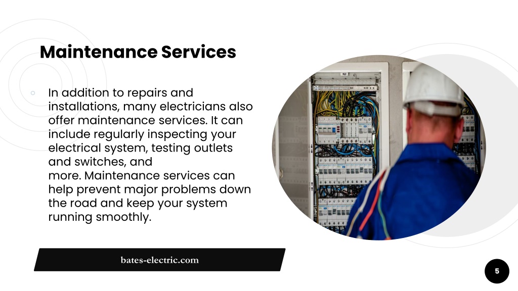 Maintenance Services In addition to repairs and installations, many electricians also offer maintenance services. It can include regularly inspecting your electrical system, testing outlets and switches, and more.Maintenance services can help prevent major problems down the road and keep your system running smoothly. ○ bates-electric.com 5