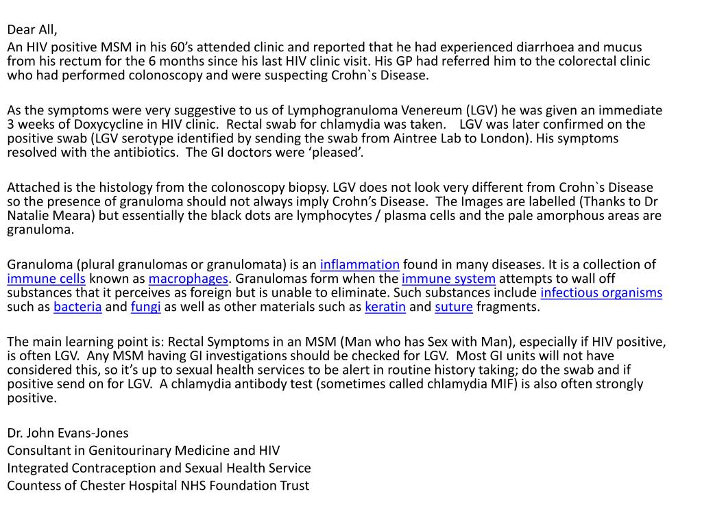Dear All, An HIV positive MSM in his 60’s attended clinic and reported that he had experienced diarrhoea and mucus from his rectum for the 6 months since his last HIV clinic visit. His GP had referred him to the colorectal clinic who had performed colonoscopy and were suspecting Crohn`s Disease. As the symptoms were very suggestive to us of LymphogranulomaVenereum (LGV) he was given an immediate 3 weeks of Doxycycline in HIV clinic. Rectal swab for chlamydia was taken. LGV was later confirmed on the positive swab (LGV serotype identified by sending the swab from Aintree Lab to London). His symptoms resolved with the antibiotics. The GI doctors were ‘pleased’. Attached is the histology from the colonoscopy biopsy. LGV does not look very different from Crohn`s Disease so the presence of granuloma should not always imply Crohn’s Disease. The Images are labelled (Thanks to Dr Natalie Meara) but essentially the black dots are lymphocytes / plasma cells and the pale amorphous areas are granuloma. Granuloma (plural granulomas or granulomata) is an inflammation found in many diseases. It is a collection of immune cells known as macrophages. Granulomas form when the immune system attempts to wall off substances that it perceives as foreign but is unable to eliminate. Such substances include infectious organisms such as bacteria and fungi as well as other materials such as keratin and suture fragments. The main learning point is: Rectal Symptoms in an MSM (Man who has Sex with Man), especially if HIV positive, is often LGV. Any MSM having GI investigations should be checked for LGV. Most GI units will not have considered this, so it’s up to sexual health services to be alert in routine history taking; do the swab and if positive send on for LGV. A chlamydia antibody test (sometimes called chlamydia MIF) is also often strongly positive. Dr. John Evans-Jones Consultant in Genitourinary Medicine and HIV Integrated Contraception and Sexual Health Service Countess of Chester Hospital NHS Foundation Trust