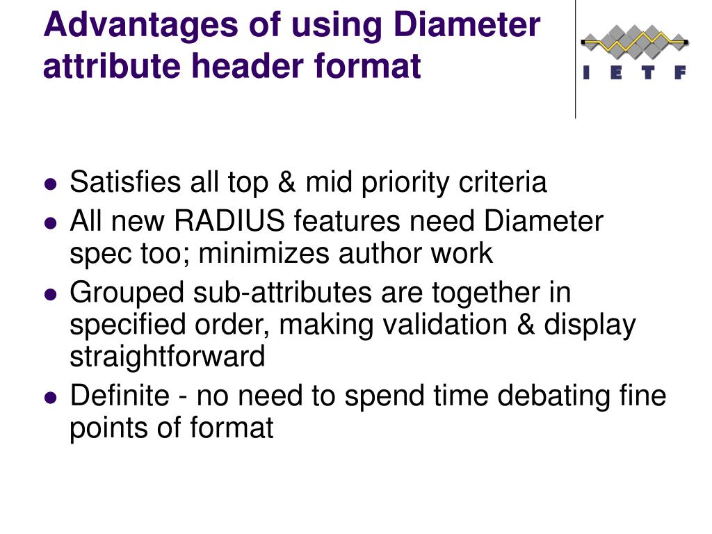 Advantages of using Diameter attribute header format • Satisfies all top & mid priority criteria • All new RADIUS features need Diameter spec too; minimizes author work • Grouped sub-attributes are together in specified order, making validation & display straightforward • Definite - no need to spend time debating fine points of format