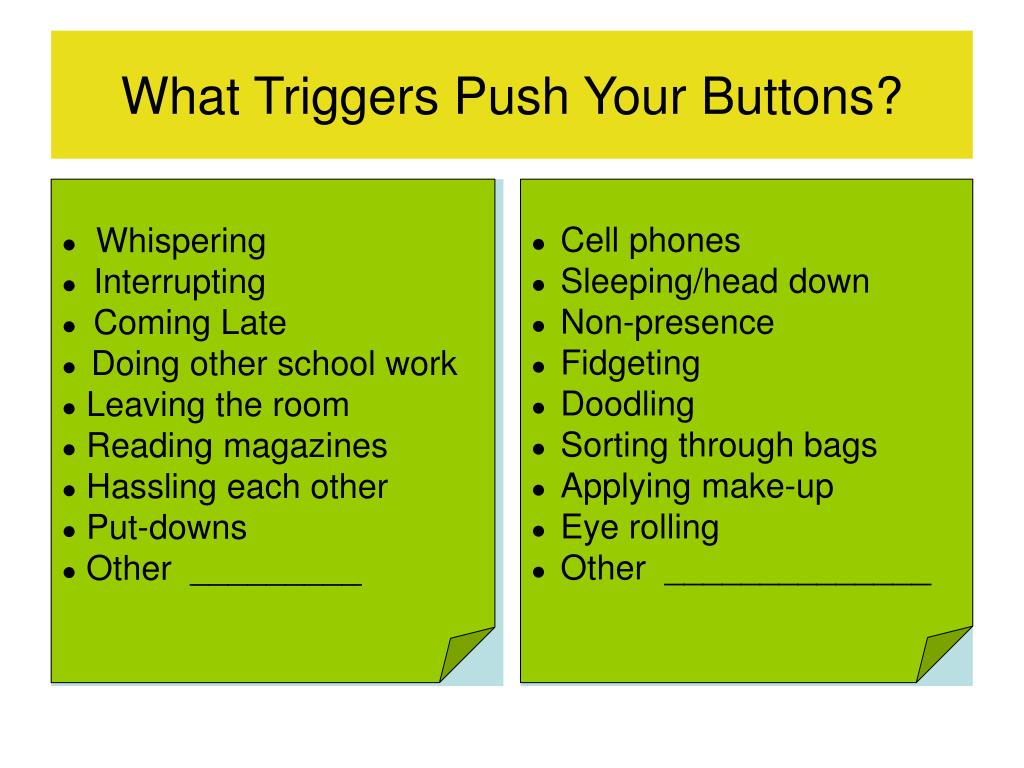 What Triggers Push Your Buttons? ● Whispering ● Interrupting ● Coming Late ● Doing other school work ● Leaving the room ● Reading magazines ● Hassling each other ● Put-downs ● Other _________ ● Cell phones ● Sleeping/head down ● Non-presence ● Fidgeting ● Doodling ● Sorting through bags ● Applying make-up ● Eye rolling ● Other ______________