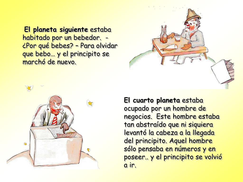 El planeta siguiente estaba habitado por un bebedor. -¿Por qué bebes? – Para olvidar que bebo… y el principito se marchó de nuevo. El cuarto planeta estaba ocupado por un hombre de negocios. Este hombre estaba tan abstraído que ni siquiera levantó la cabeza a la llegada del principito. Aquel hombre sólo pensaba en números y en poseer.. y el principito se volvió a ir.