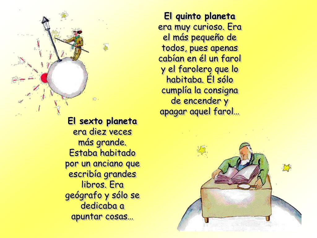 El quinto planeta era muy curioso. Era el más pequeño de todos, pues apenas cabían en él un farol y el farolero que lo habitaba. Él sólo cumplía la consigna de encender y apagar aquel farol… El sexto planeta era diez veces más grande. Estaba habitado por un anciano que escribía grandes libros. Era geógrafo y sólo se dedicaba a apuntar cosas…
