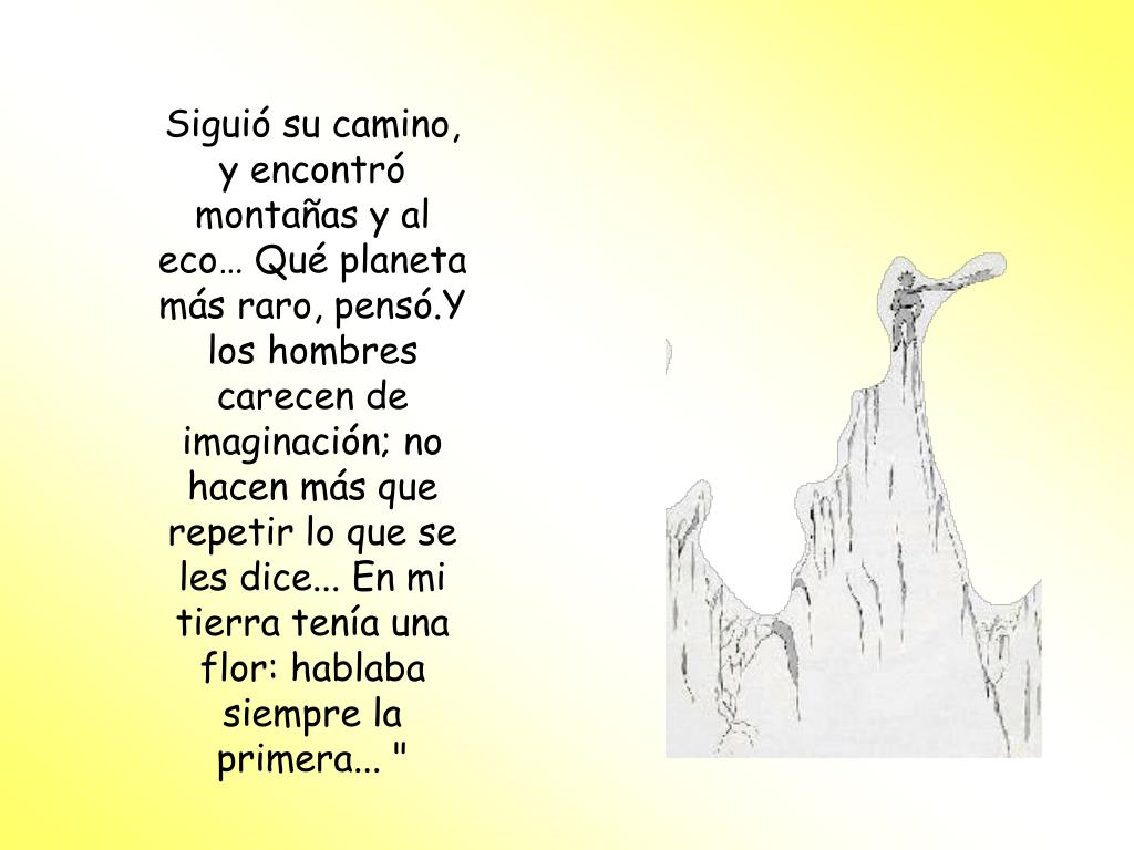 Siguió su camino, y encontró montañas y al eco… Qué planeta más raro, pensó.Y los hombres carecen de imaginación; no hacen más que repetir lo que se les dice... En mi tierra tenía una flor: hablaba siempre la primera... "