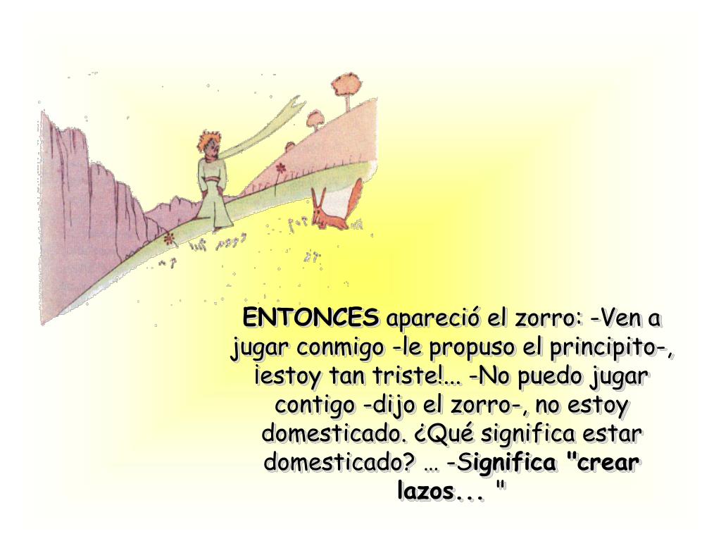 ENTONCES apareció el zorro: -Ven a jugar conmigo -le propuso el principito-, ¡estoy tan triste!... -No puedo jugar contigo -dijo el zorro-, no estoy domesticado. ¿Qué significa estar domesticado? … -Significa "crear lazos... "