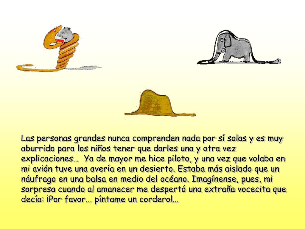 Las personas grandes nunca comprenden nada por sí solas y es muy aburrido para los niños tener que darles una y otra vez explicaciones… Ya de mayor me hice piloto, y una vez que volaba en mi avión tuve una avería en un desierto. Estaba más aislado que un náufrago en una balsa en medio del océano. Imagínense, pues, mi sorpresa cuando al amanecer me despertó una extraña vocecita que decía: ¡Por favor... píntame un cordero!...