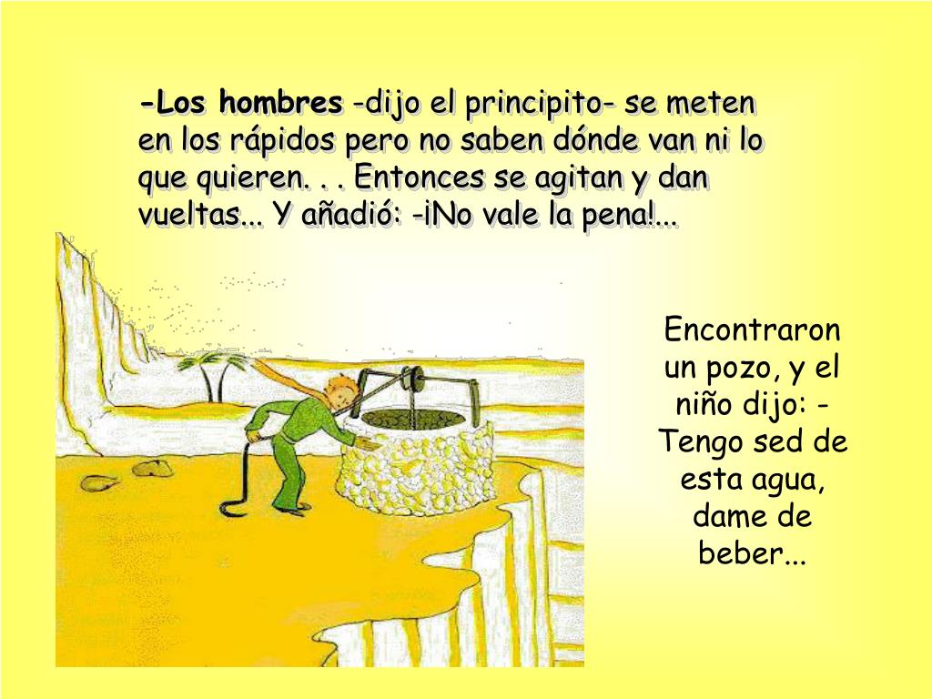-Los hombres -dijo el principito- se meten en los rápidos pero no saben dónde van ni lo que quieren. . . Entonces se agitan y dan vueltas... Y añadió: -¡No vale la pena!... Encontraron un pozo, y el niño dijo: -Tengo sed de esta agua, dame de beber...