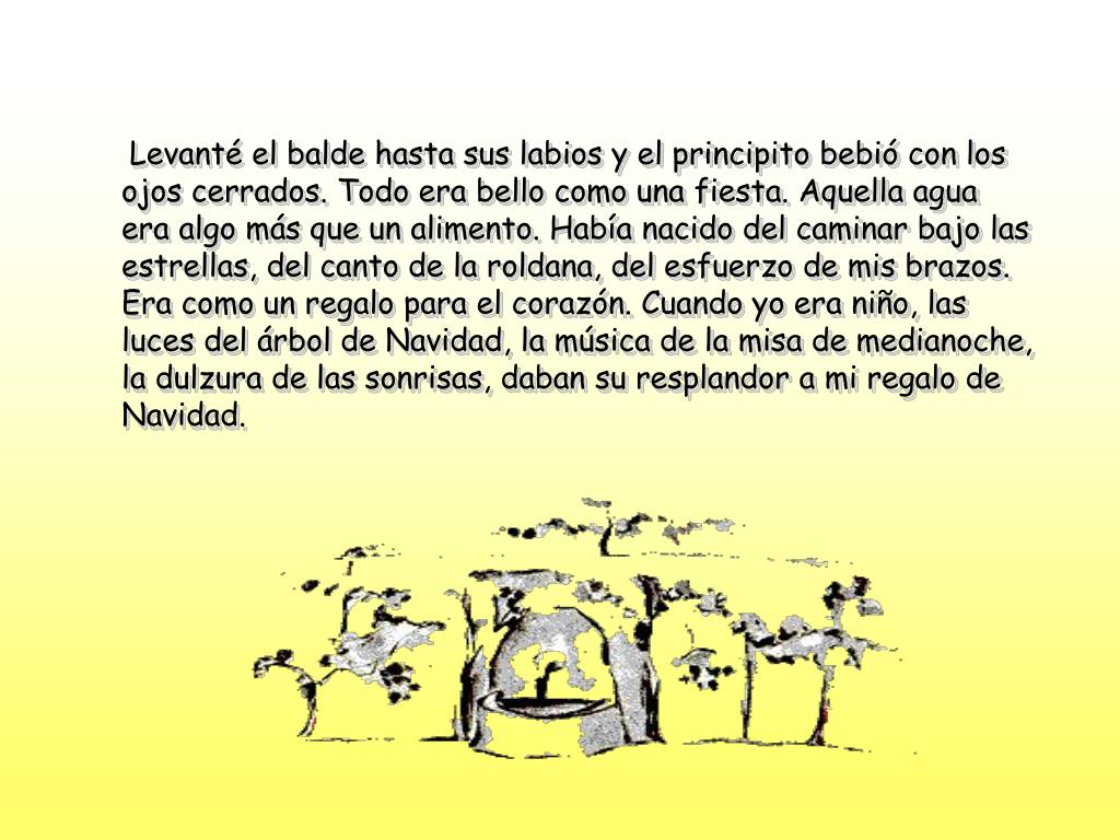 Levanté el balde hasta sus labios y el principito bebió con los ojos cerrados. Todo era bello como una fiesta. Aquella agua era algo más que un alimento. Había nacido del caminar bajo las estrellas, del canto de la roldana, del esfuerzo de mis brazos. Era como un regalo para el corazón. Cuando yo era niño, las luces del árbol de Navidad, la música de la misa de medianoche, la dulzura de las sonrisas, daban su resplandor a mi regalo de Navidad.