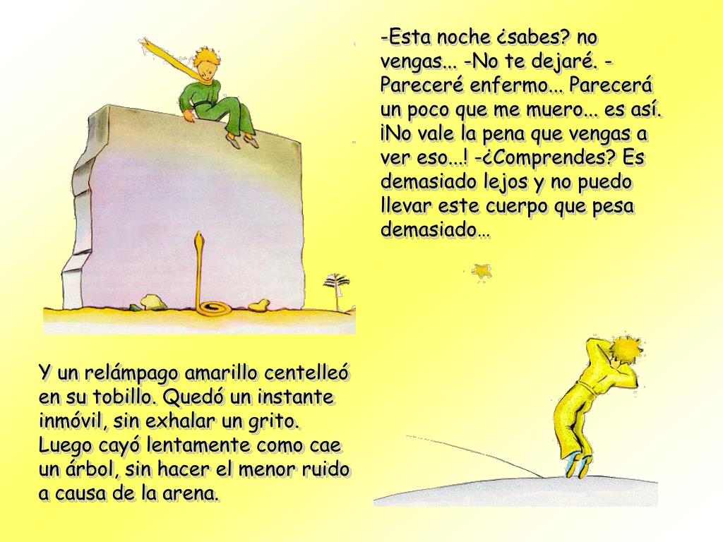 -Esta noche ¿sabes? no vengas... -No te dejaré. -Pareceré enfermo... Parecerá un poco que me muero... es así. ¡No vale la pena que vengas a ver eso...! -¿Comprendes? Es demasiado lejos y no puedo llevar este cuerpo que pesa demasiado… Y un relámpago amarillo centelleó en su tobillo. Quedó un instante inmóvil, sin exhalar un grito. Luego cayó lentamente como cae un árbol, sin hacer el menor ruido a causa de la arena.