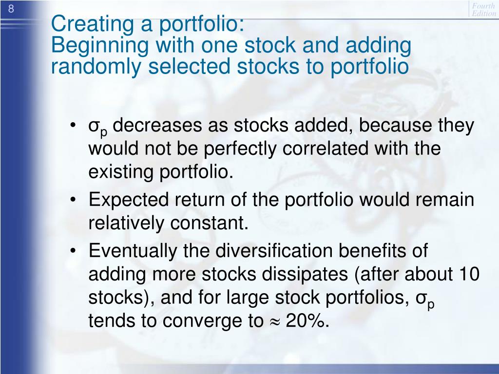 Creating a portfolio:Beginning with one stock and adding randomly selected stocks to portfolio • σp decreases as stocks added, because they would not be perfectly correlated with the existing portfolio. • Expected return of the portfolio would remain relatively constant. • Eventually the diversification benefits of adding more stocks dissipates (after about 10 stocks), and for large stock portfolios, σp tends to converge to 20%.