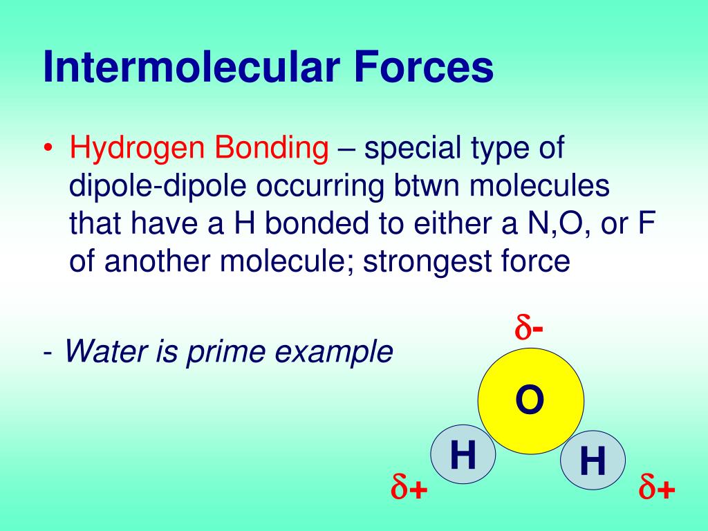 Intermolecular Forces • Hydrogen Bonding – special type of dipole-dipole occurring btwn molecules that have a H bonded to either a N,O, or F of another molecule; strongest force - Water is prime example - O O H H + +