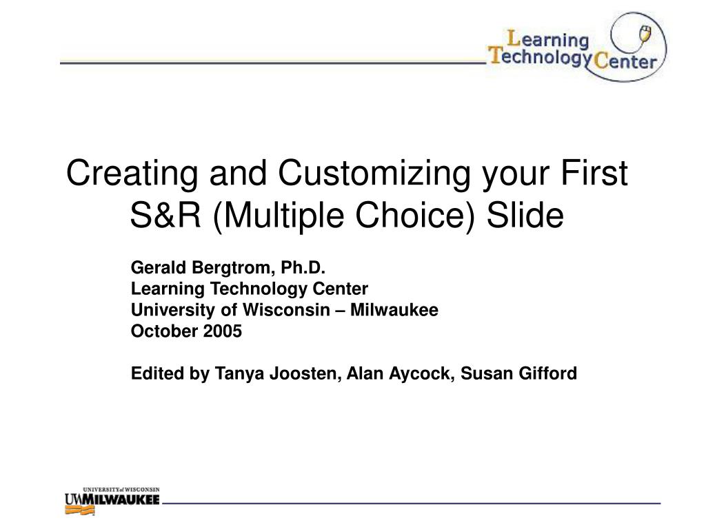 Creating and Customizing your First S&R (Multiple Choice) Slide Gerald Bergtrom, Ph.D.Learning Technology CenterUniversity of Wisconsin – MilwaukeeOctober 2005 Edited by Tanya Joosten, Alan Aycock,Susan Gifford