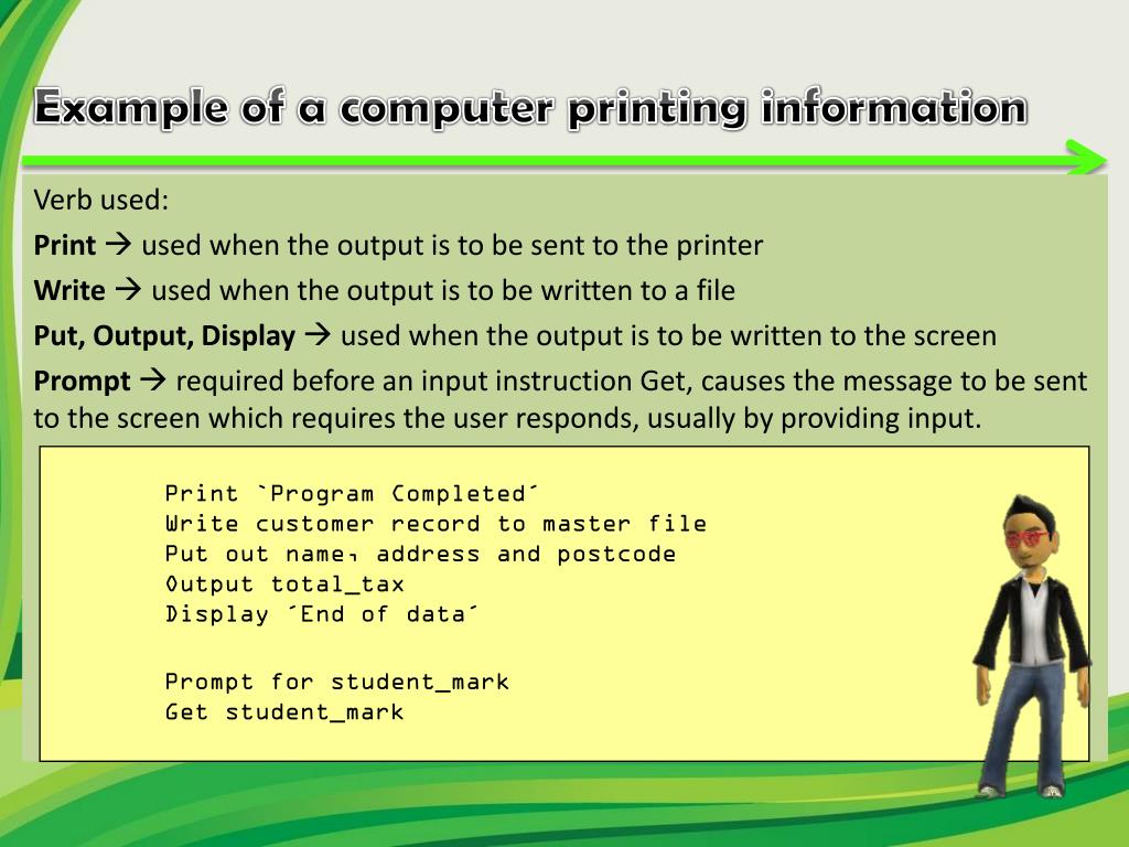 Verb used: Print used when the output is to be sent to the printer Write used when the output is to be written to a file Put, Output, Display used when the output is to be written to the screen Prompt required before an input instruction Get, causes the message to be sent to the screen which requires the user responds, usually by providing input. Example of a computer printing information Print `Program Completed´ Write customer record to master file Put out name, address and postcode Output total_tax Display ´End of data´ Prompt for student_mark Get student_mark