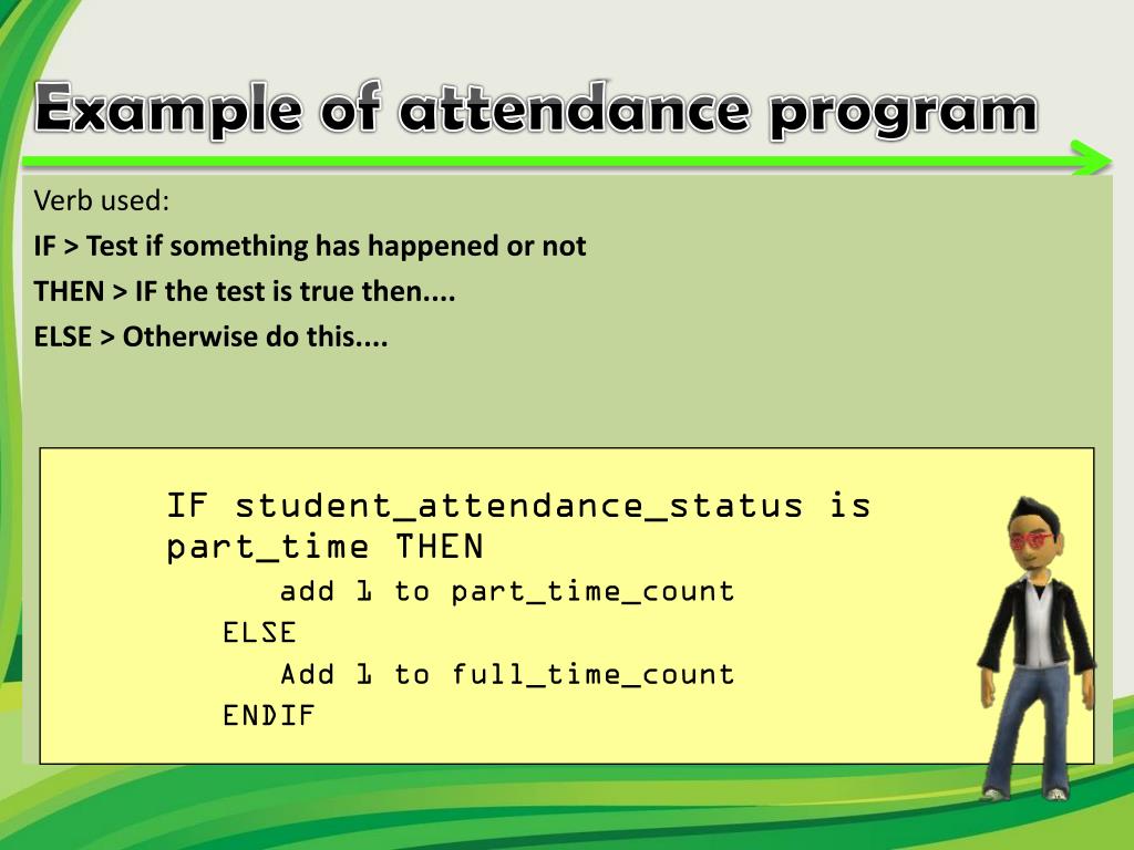 Verb used: IF > Test if something has happened or not THEN > IF the test is true then.... ELSE > Otherwise do this.... Example of attendance program IF student_attendance_status is part_time THEN add 1 to part_time_count ELSE Add 1 to full_time_count ENDIF