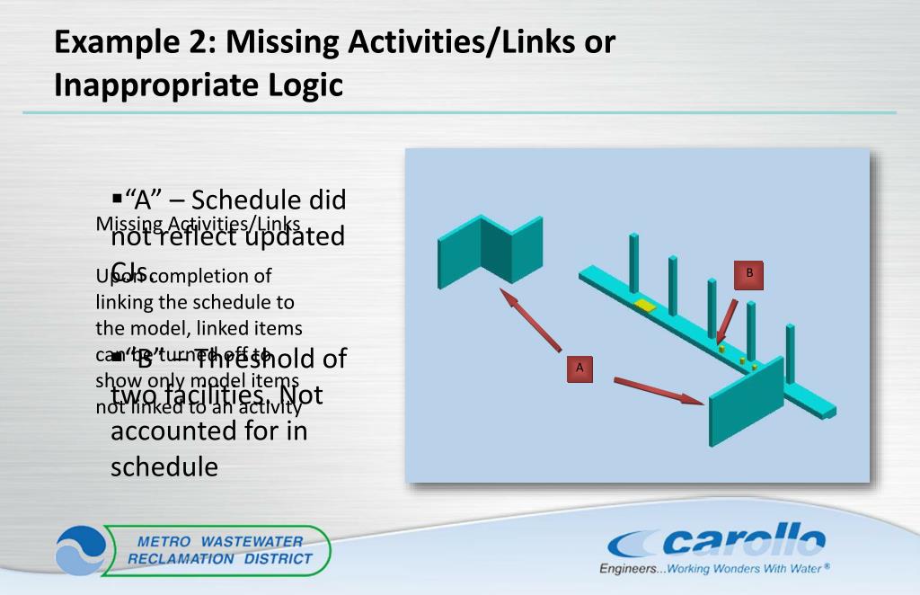 Example 2: Missing Activities/Links or Inappropriate Logic “A” – Schedule did not reflect updated CJs. “B” – Threshold of two facilities. Not accounted for in schedule Missing Activities/Links Upon completion of linking the schedule to the model, linked items can be turned off to show only model items not linked to an activity B A