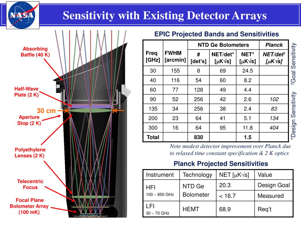 Sensitivity with Existing Detector Arrays EPIC Projected Bands and Sensitivities Absorbing Baffle (40 K) Half-Wave Plate (2 K) *Design Sensitivity †Goal Sensitivity 30 cm Aperture Stop (2 K) Note modest detector improvement over Planck due to relaxed time constant specification & 2 K optics Polyethylene Lenses (2 K) Planck Projected Sensitivities Telecentric Focus Focal Plane Bolometer Array (100 mK)
