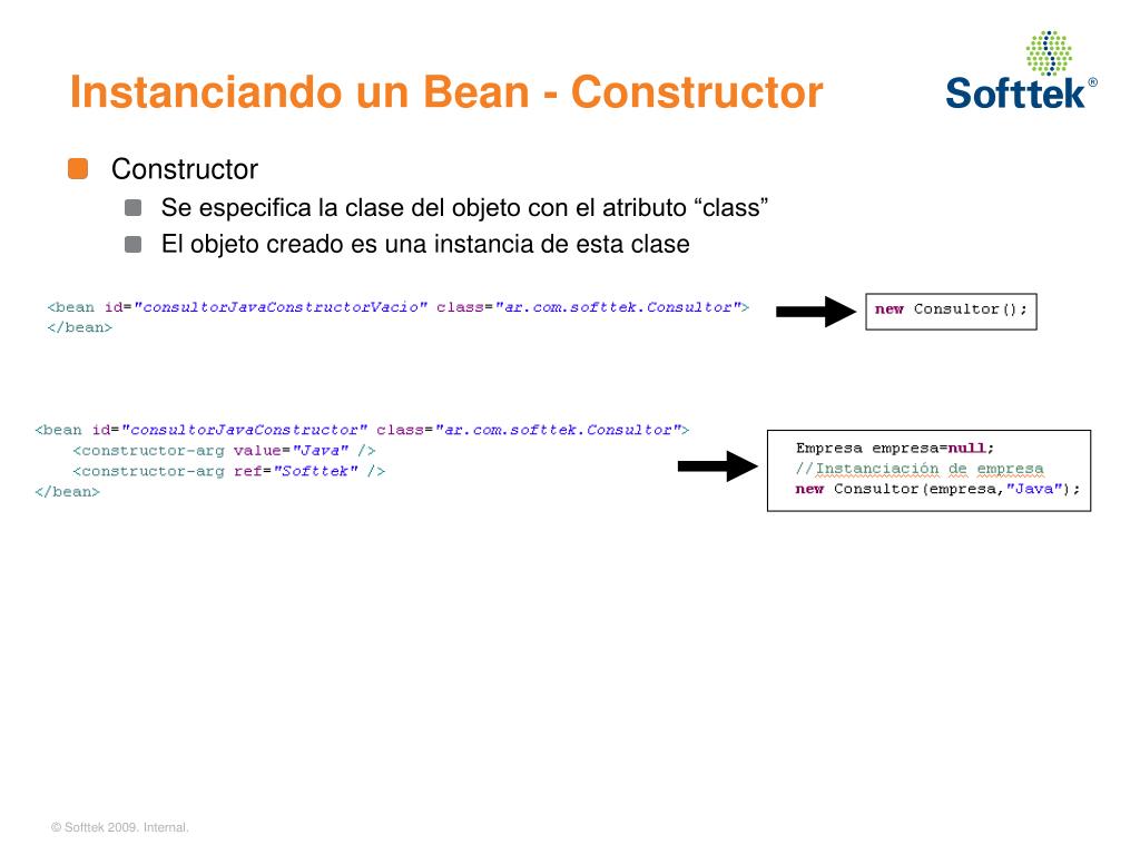 Instanciando un Bean - Constructor • Constructor • Se especifica la clase del objeto con el atributo “class” • El objeto creado es una instancia de esta clase