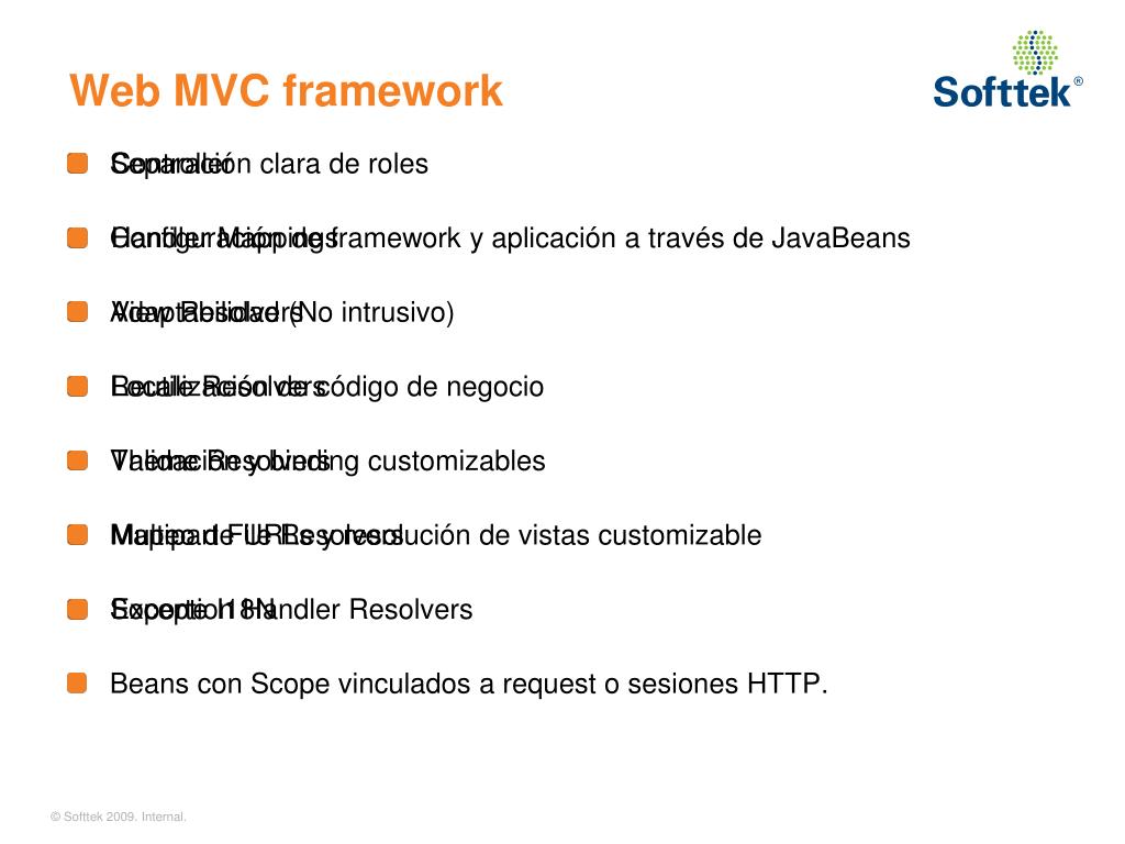 Web MVC framework • Separación clara de roles • Configuración de framework y aplicación a través de JavaBeans • Adaptabilidad (No intrusivo) • Reutilización de código de negocio • Validación y binding customizables • Mapeo de URLs y resolución de vistas customizable • Soporte I18N • Beans con Scope vinculados a request o sesiones HTTP. • Controller • Handler Mappings • View Resolvers • Locale Resolvers • Theme Resolvers • Multipart File Resolvers • Exception Handler Resolvers