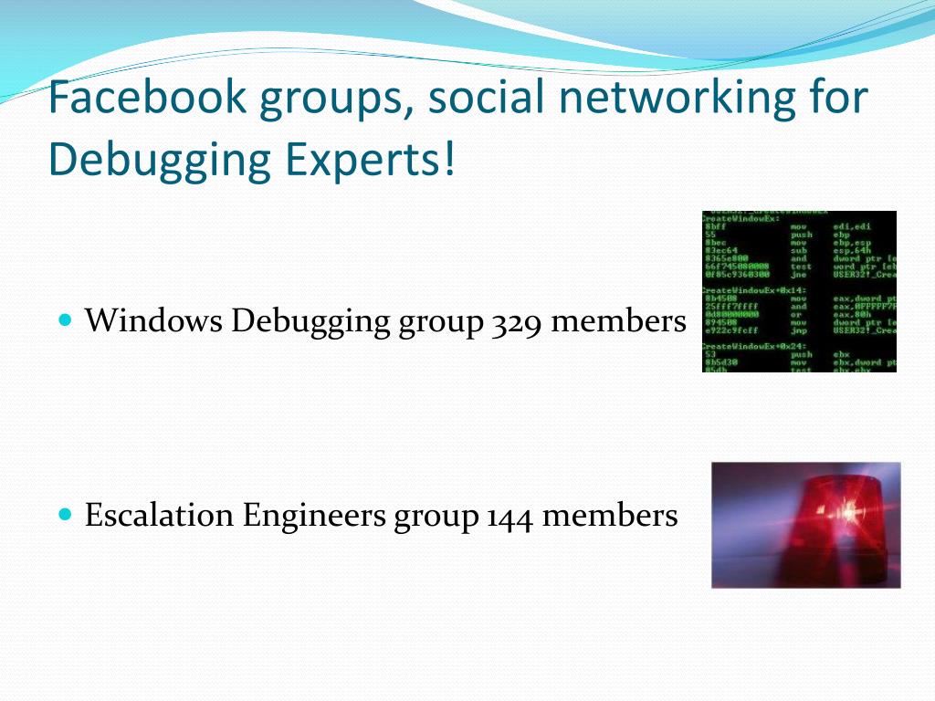 Facebook groups, social networking for Debugging Experts! • Windows Debugging group 329 members • Escalation Engineers group 144 members