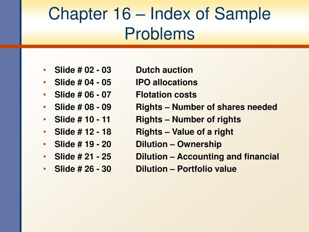 16. Raising Capital . Chapter 16 – Index of Sample Problems. Slide # 02 - 03 Dutch auction Slide # 04 - 05 IPO allocations Slide # 06 - 07 Flotation costs Slide # 08 - 09 Rights – Number of shares needed Slide # 10 - 11 Rights – Number of rights Slide # 12 - 18 Rights – Value of a right