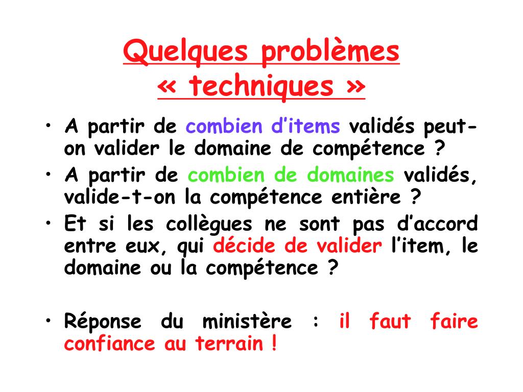 Quelques problèmes « techniques » • A partir de combien d’items validés peut-on valider le domaine de compétence ? • A partir de combien de domaines validés, valide-t-on la compétence entière ? • Et si les collègues ne sont pas d’accord entre eux, qui décide de valider l’item, le domaine ou la compétence ? • Réponse du ministère : il faut faire confiance au terrain !