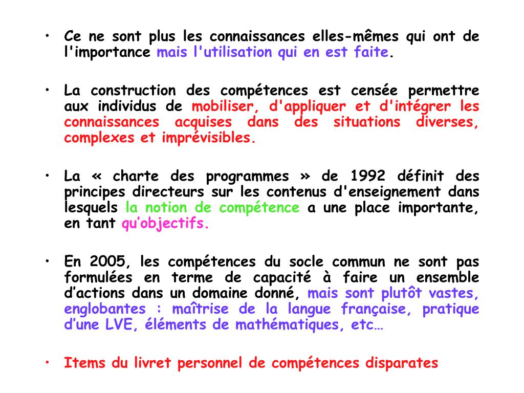 Ce ne sont plus les connaissances elles-mêmes qui ont de l'importance mais l'utilisation qui en est faite. • La construction des compétences est censée permettre aux individus de mobiliser, d'appliquer et d'intégrer les connaissances acquises dans des situations diverses, complexes et imprévisibles. • La « charte des programmes » de 1992 définit des principes directeurs sur les contenus d'enseignement dans lesquels la notion de compétence a une place importante, en tant qu’objectifs. • En 2005, les compétences du socle commun ne sont pas formulées en terme de capacité à faire un ensemble d’actions dans un domaine donné, mais sont plutôt vastes, englobantes : maîtrise de la langue française, pratique d’une LVE, éléments de mathématiques, etc… • Items du livret personnel de compétences disparates