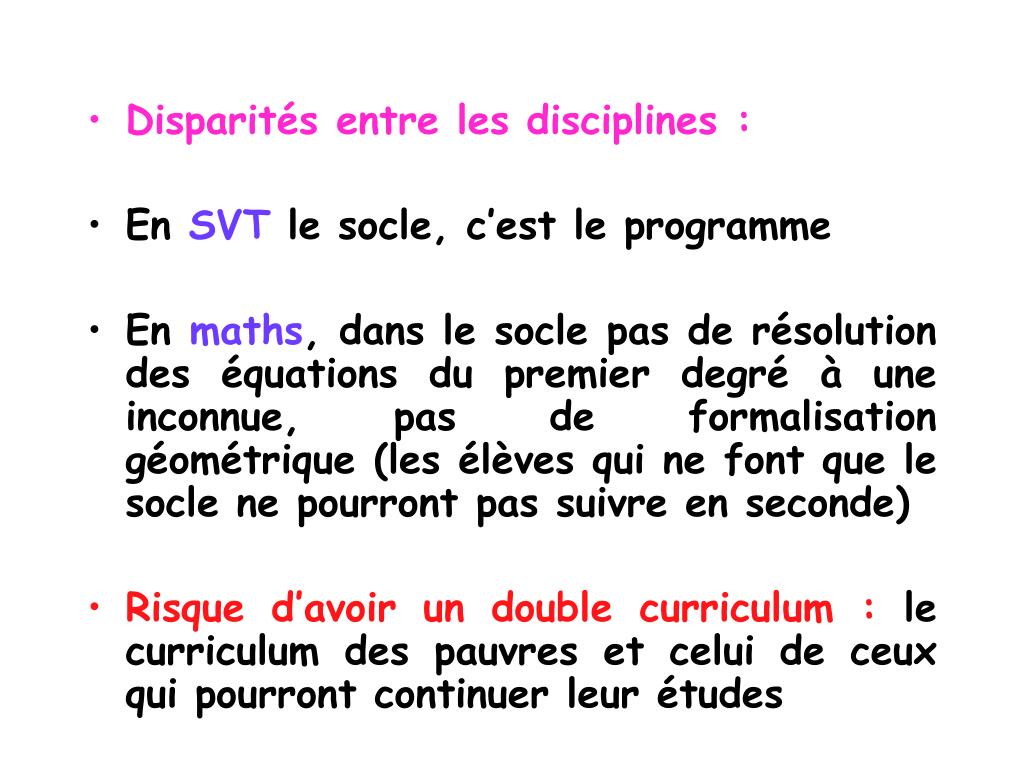 Disparités entre les disciplines : • En SVT le socle, c’est le programme • En maths, dans le socle pas de résolution des équations du premier degré à une inconnue, pas de formalisation géométrique (les élèves qui ne font que le socle ne pourront pas suivre en seconde) • Risque d’avoir un double curriculum : le curriculum des pauvres et celui de ceux qui pourront continuer leur études
