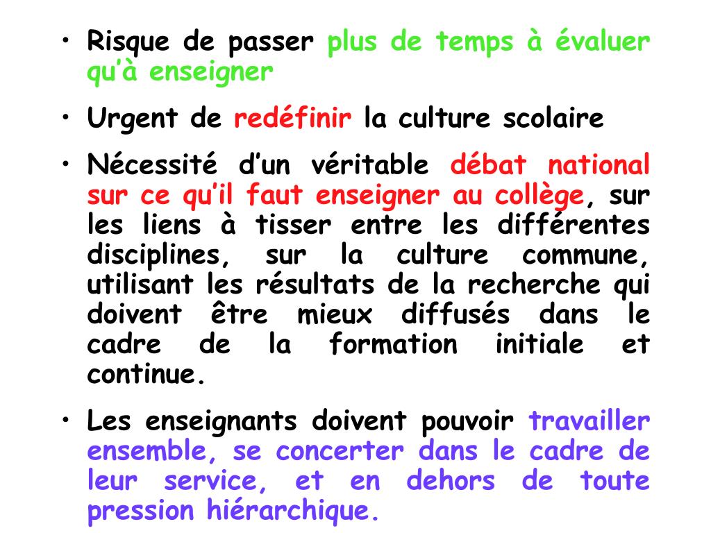Risque de passer plus de temps à évaluer qu’à enseigner • Urgent de redéfinir la culture scolaire • Nécessité d’un véritable débat national sur ce qu’il faut enseigner au collège, sur les liens à tisser entre les différentes disciplines, sur la culture commune, utilisant les résultats de la recherche qui doivent être mieux diffusés dans le cadre de la formation initiale et continue. • Les enseignants doivent pouvoir travailler ensemble, se concerter dans le cadre de leur service, et en dehors de toute pression hiérarchique.