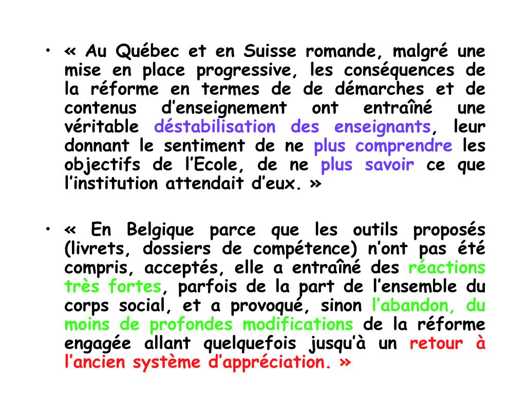 « Au Québec et en Suisse romande, malgré une mise en place progressive, les conséquences de la réforme en termes de de démarches et de contenus d’enseignement ont entraîné une véritable déstabilisation des enseignants, leur donnant le sentiment de ne plus comprendre les objectifs de l’Ecole, de ne plus savoir ce que l’institution attendait d’eux. » • « En Belgique parce que les outils proposés (livrets, dossiers de compétence) n’ont pas été compris, acceptés, elle a entraîné des réactions très fortes, parfois de la part de l’ensemble du corps social, et a provoqué, sinon l’abandon, du moins de profondes modifications de la réforme engagée allant quelquefois jusqu’à un retour à l’ancien système d’appréciation. »